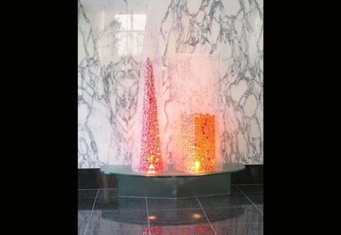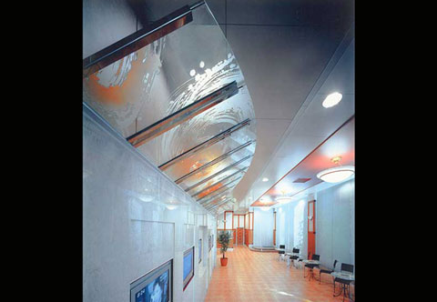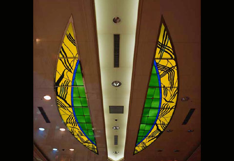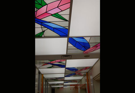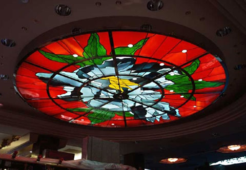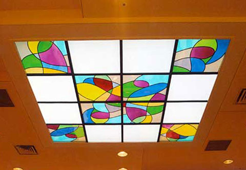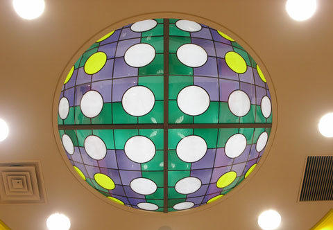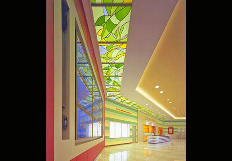 建築物の設計・デザインにおいて、アミューズメント施設や商業施設にステンドグラスを用いることで、プラスチックを使った照明とはイメージが異なる良い感じの照明環境が得られます。お気軽にご相談ください。