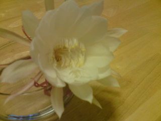 あとは切り花にし家の中へ。夜の間、華やかな姿と香りで魅了。一夜限りしか咲かない美しい花。まさに儚い美しさです。美人薄命とはこういうなんですね。(a)