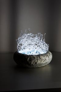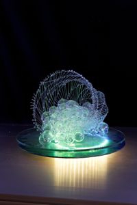 lamp workはflame workingとも言い(炎の作業ですね)私は酸素バーナー(酸素とプロパンガスの混合火)で作るのですが ステンドグラスと違い 暖かい白熱灯よりもLEDライトが冷たくて良く似合うと思うのです。むろん電球が製造中止になる様ですので ステンドグラスもLEDもしくは蛍光灯の光で見る機会が多くなるでしょうし、価格も光の色もより電球色に近いものも出てくると思います。紫色など電球色だと茶色っぽくなる色はLEDの方が美しく見えるのではないかと。。。ガラスの色を選ぶ時に吟味する事が必須です。