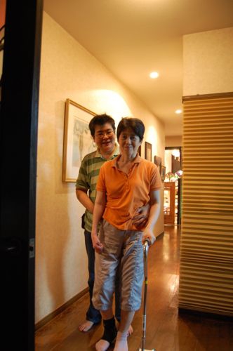 そんな夕方 電話があり友人が訪ねてくれた。車椅子なしでの歩行練習をしているトモちゃんとクマタロウ氏とモダンちゃん。バリアフリーではないが ゆっくり上手に四点杖で歩いて上がって来た。upしてくれていたYou Tubeではここまで回復した知ちゃんの画像に涙が出た。今こうして歩き始めた彼女の姿を目の前で見ていると 一時は生死の境にいた彼女の生きるパワーとサポートしてきたクマちゃんのたゆまぬ努力が(口で言うのは簡単だけど)繋いだんだろうと思う。ブログの向こうの共通の友人に見せたいから写真撮っていい?との了解もとって誇らしくupしました。こんなに元気になってますよ。
