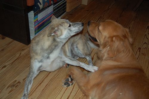 散歩に行けない二匹はたまにじゃれあい スキンシップを求めてベタベタ 「マッキンリー」に登ったり「アイガー北壁」に挑んだりする(スカパーで)主を「お宅め~」と思いながら休みが明けて遊び相手が来る事を心待ちにしながら過ごしているのでした。