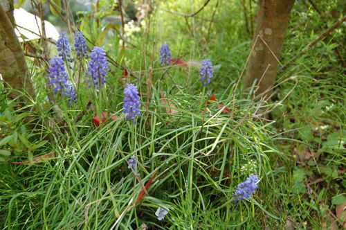 久しぶりにカワイイ姿を見せてくれたムスカリ。モッコウバラの柔らかな新葉