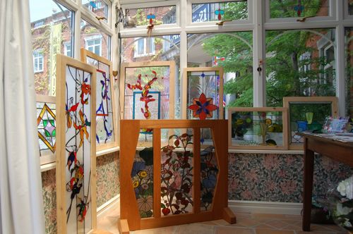 展示しているコンサバトリーはいいお天気の午後は汗ばむほどで お客様の合間に外のベンチでホッと一息。新緑が瑞々しい。