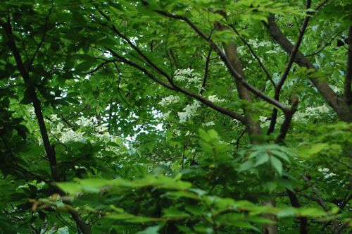 ヤマボウシの花が咲いているがずっと上の方。 今年最後の椿(五月中旬なんて!)