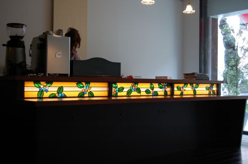 眼鏡橋近くの趣きのある小路に立地するカフェ「一花五葉」に納品したパネルのクリーニング作業でした。重い鉄のドアの向こうにライティングしたカウンターが在って 焦れた人に会う様な気持ちで 納まる所に納まった我が子を見るのです。最後の最後に決まった山吹色のガラスが良かったと胸を撫で下ろし施主の感想を聴いて。ドイツ製のオプチュールジュエルの抑えたたカラーも素敵だった。手放した後は育った我が子を見る様なもの。想像を超えてその場にしっくりと適合した作品を褒めるだけなのです。いい所にいけて良かったねと。