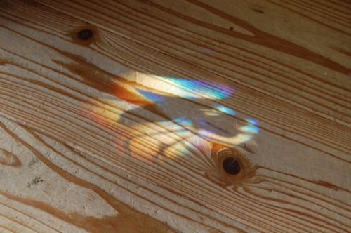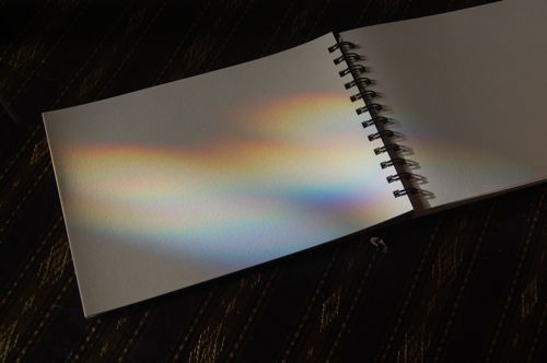 暖かい一瞬の陽射しが届けてくれるものがベベルを使ったパネルからの虹です。ふとテーブルの上にその端っこを見つけてスケッチブックで追いかけてみました。